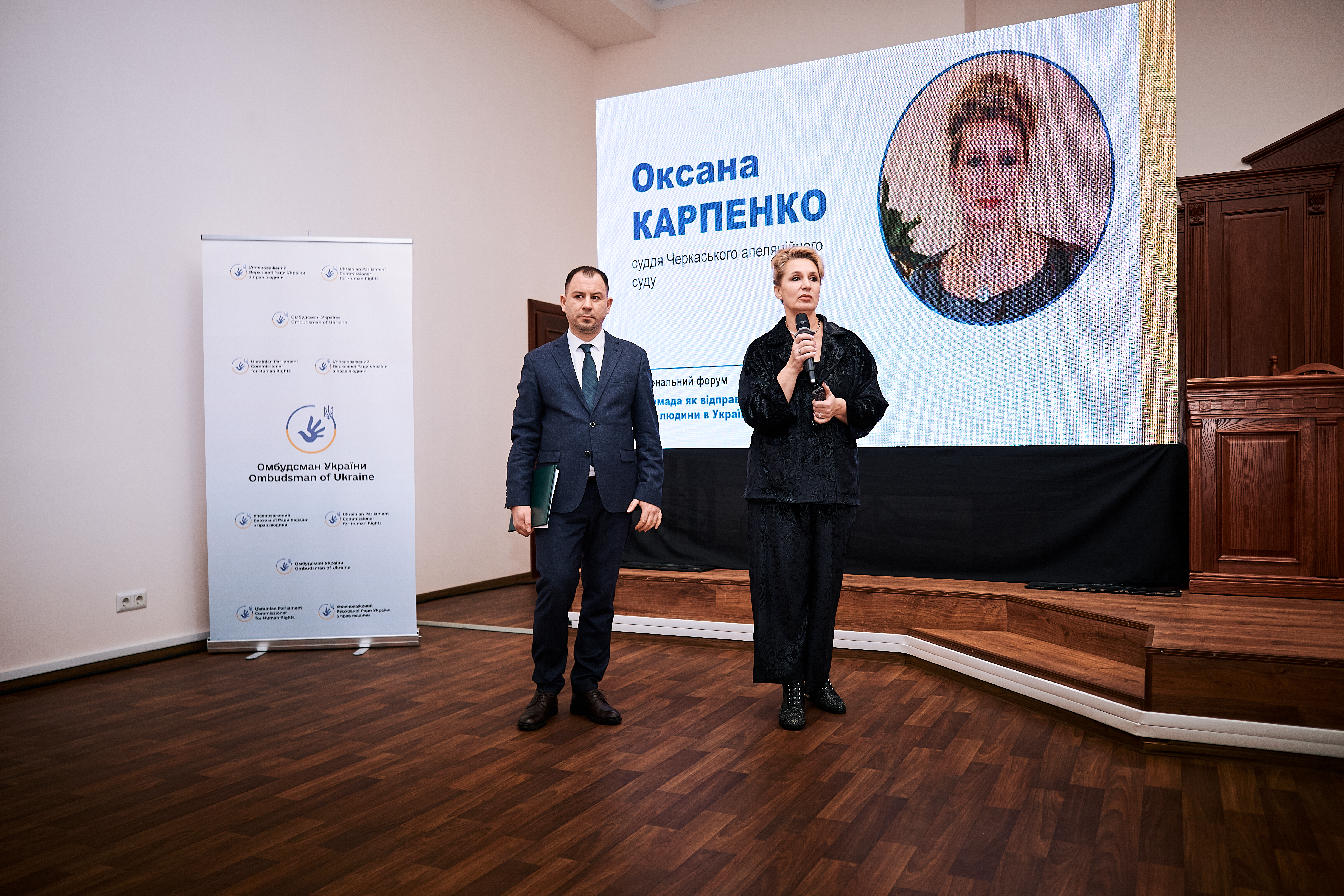 Суддя-спікер Черкаського апеляційного суду Оксана КАРПЕНКО взяла участь у регіональному форумі «Громада як відправна точка захисту прав людини в Україні», організованому Офісом Уповноваженого Верховної Ради України з прав людини за підтримки міжнародних партнерів. Захід відбувся 10 грудня у стінах Черкаського апеляційного суду та став важливою платформою для фахової дискусії щодо посилення гарантій прав людини на місцевому рівні. Форум об’єднав правозахисників, представників громадських організацій, експертів та інших учасників, які спільно працюють над посиленням гарантій прав людини та розвитку правової держави в Україні.